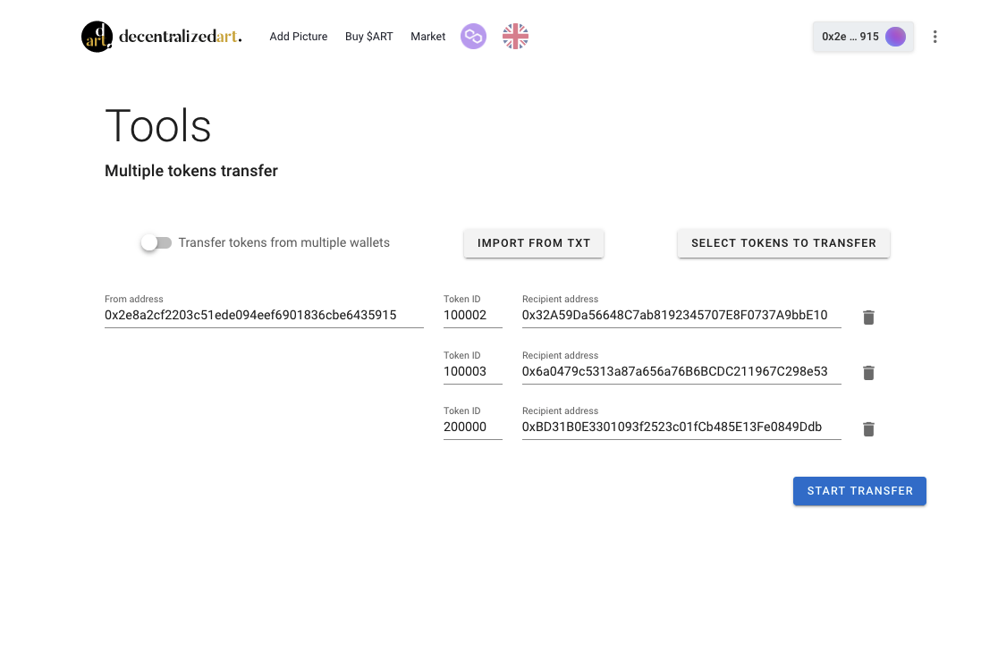 Advanced tools like the Multitransfer service offer a range of features to help users manage their NFTs more efficiently. One of these features is the ability to import a pre-configured list of wallets in the case of thousands of NFTs. This functionality is particularly useful for advanced users who are managing large numbers of NFTs and need to create a list of wallets quickly and without the need to select each wallet and indicate each NFT separately.